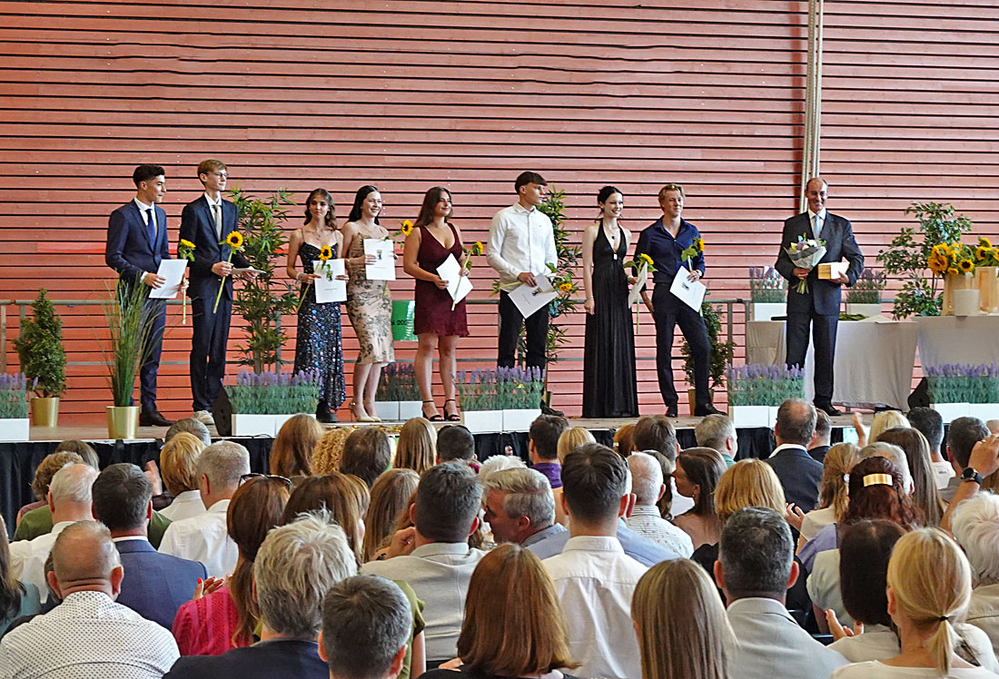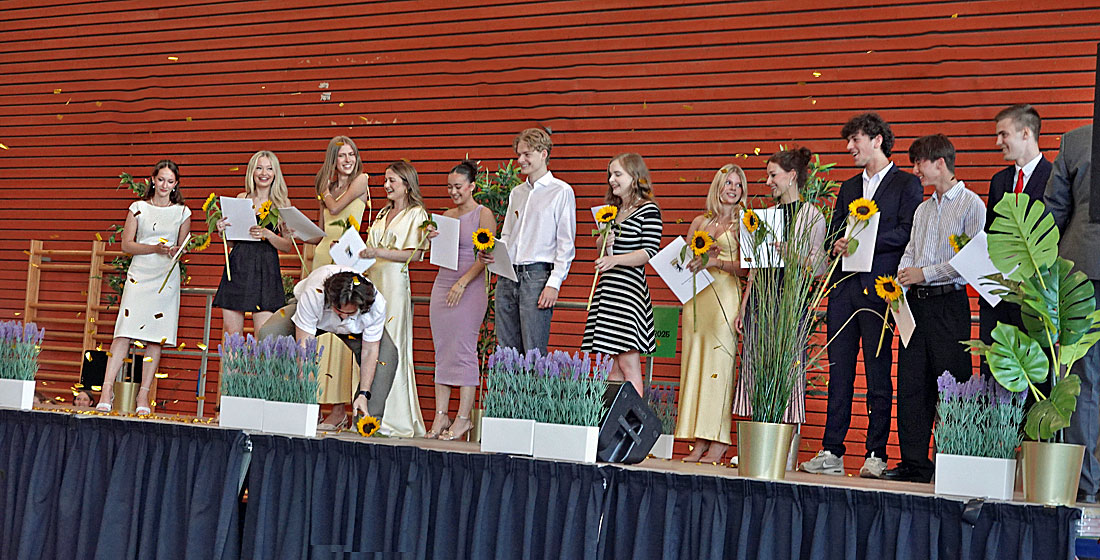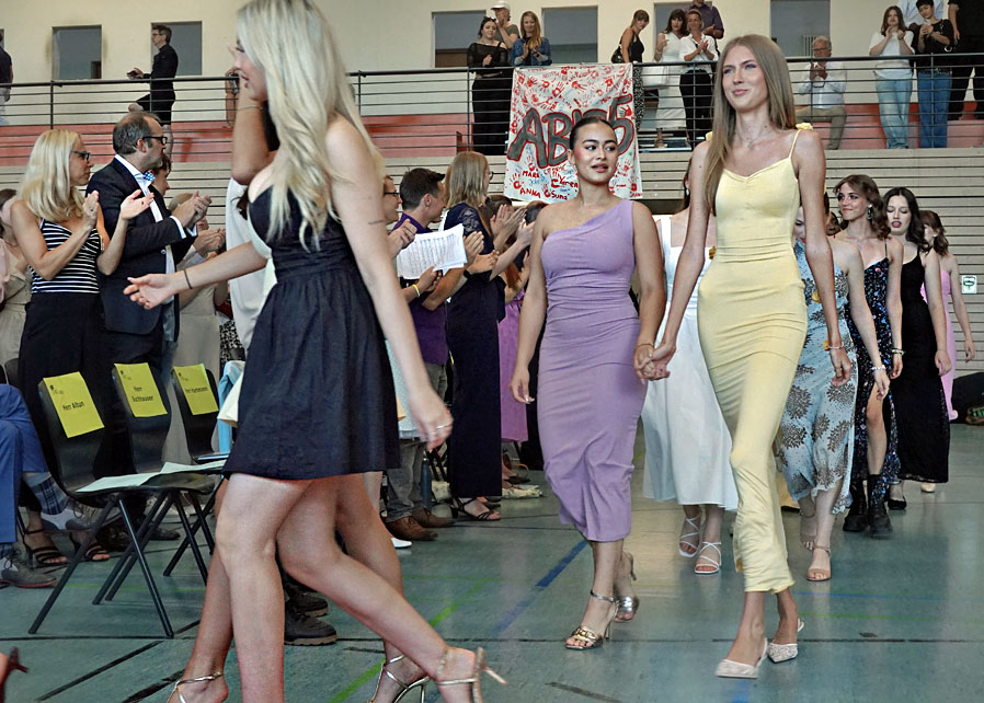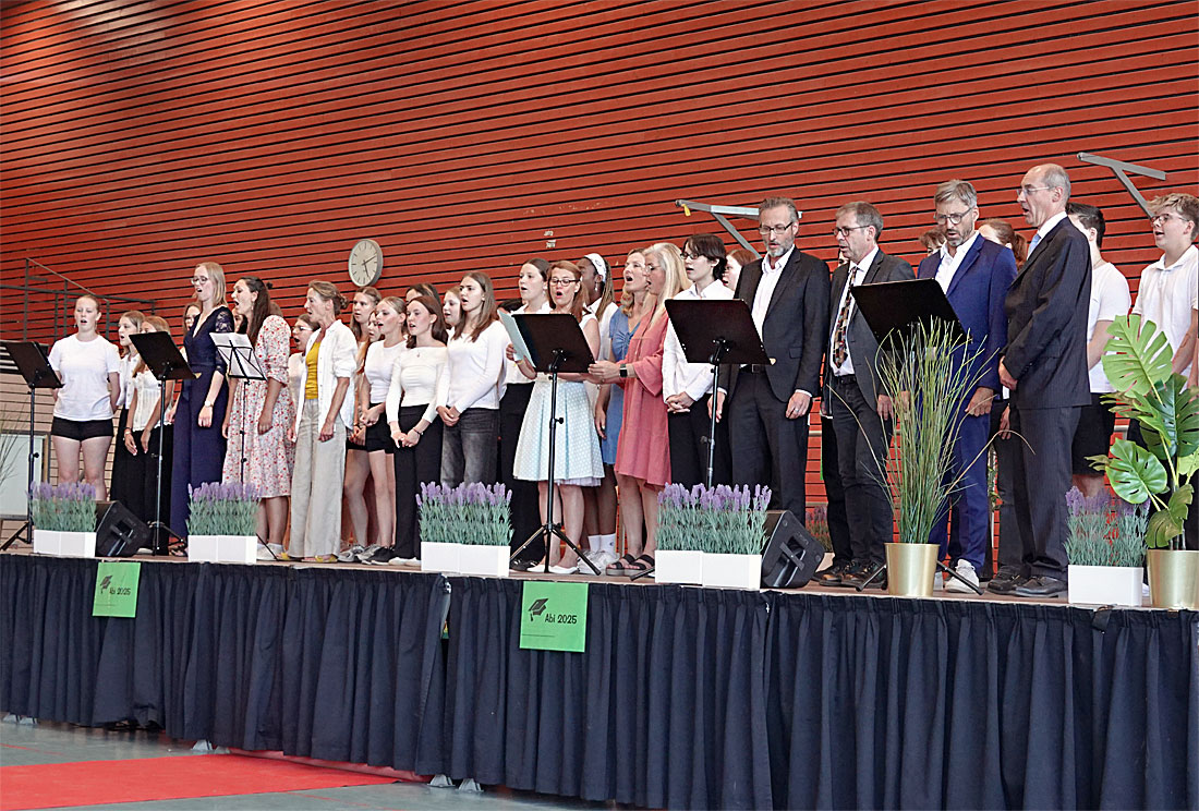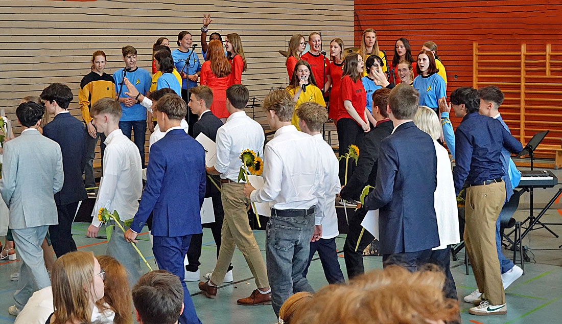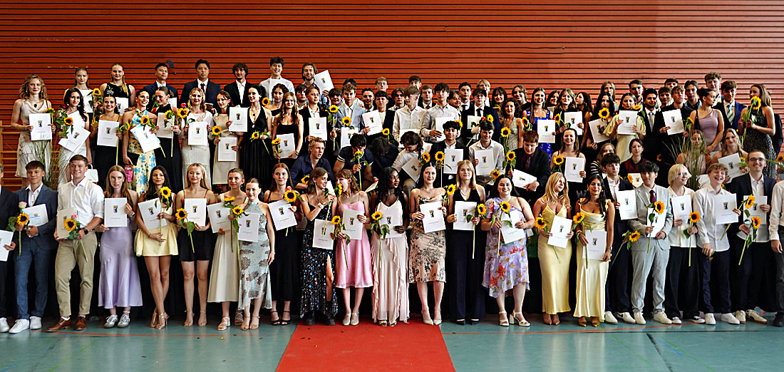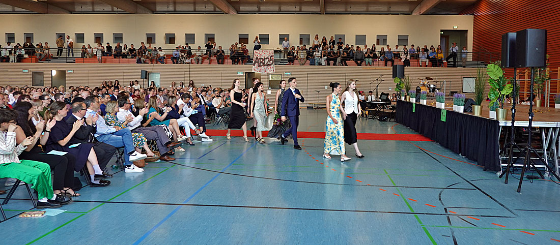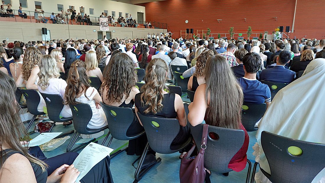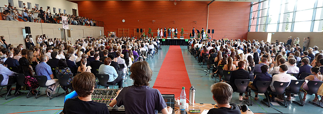 Festlicher Höhepunkt eines jeden Schuljahres: die feierliche Verleihung des Zeugnisses der Hochschulreife. 110 Abiturientinnen und Abiturienten waren gekommen, um sich – ein letzter Schritt in ihrer schulischen Laufbahn – feierlich ihr Abiturzeugnis überreichen zu lassen. Weitere Personae der heiter-festlichen Inszenierung: Erleichtert-zufriedene Eltern und Lehrer:innen, gut gelaunte Omas, neugierige Geschwister und wohl gestimmte Musikanten.