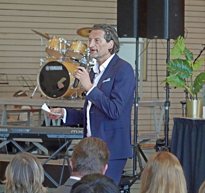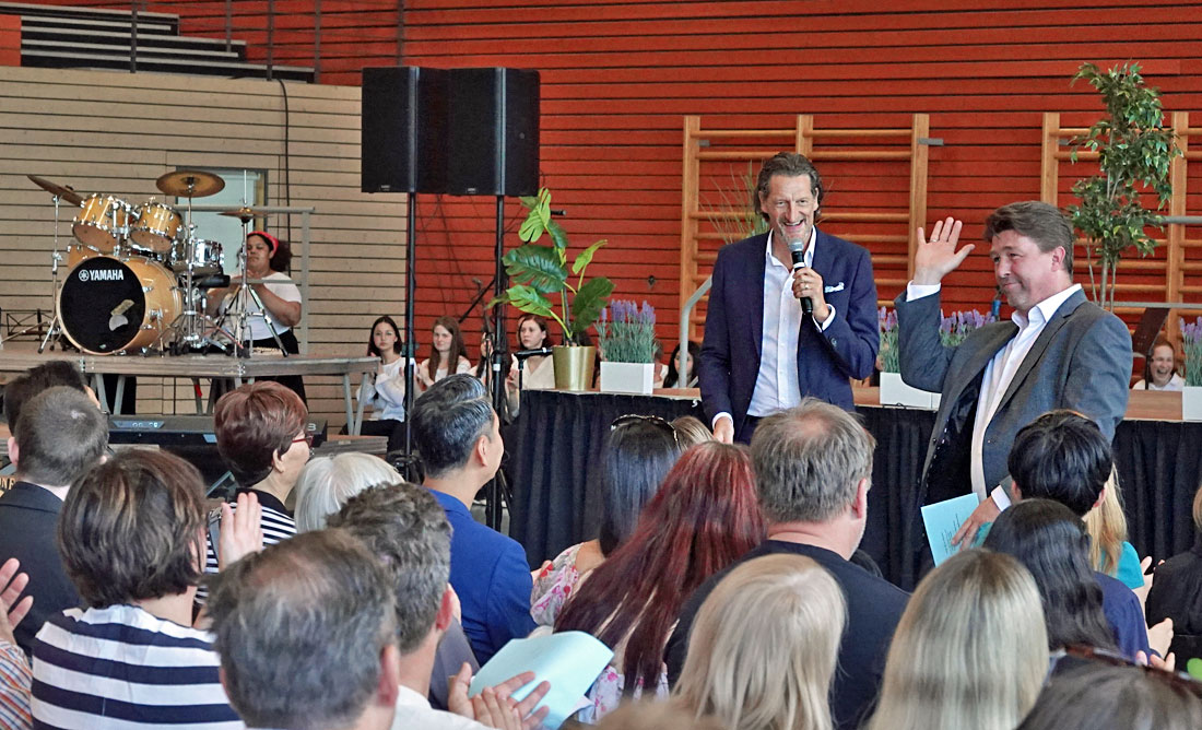 Er schließt seine Rede mit einer Einladung zum Sektempfang im Anschluss an die Abi-Verleihung.