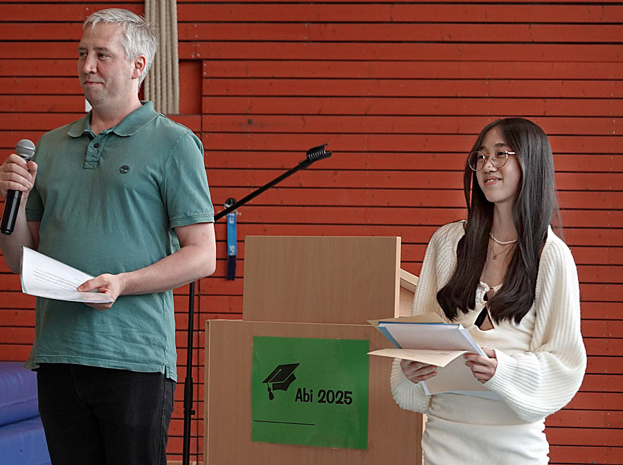 Im Namen der Gesamtelternvertretung und des Fördervereins beglückwünscht dessen stellvertretender Vorsitzender Herr Schulte die Abiturientinnen und Abiturienten des Jahrgangs 2025 zu ihrem Abschluss. Herr Schulte weist darauf hin, dass Gesamtelternvertretung und Förderverein im Hintergrund den Schulbetrieb begleiten und sich, jeder auf seine Art, in das Schulleben einbringen.