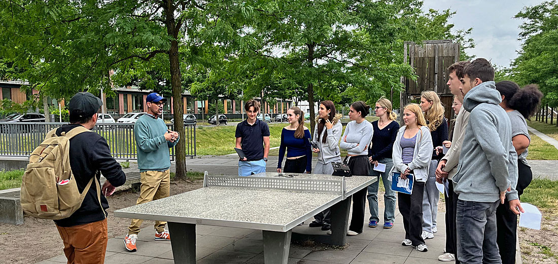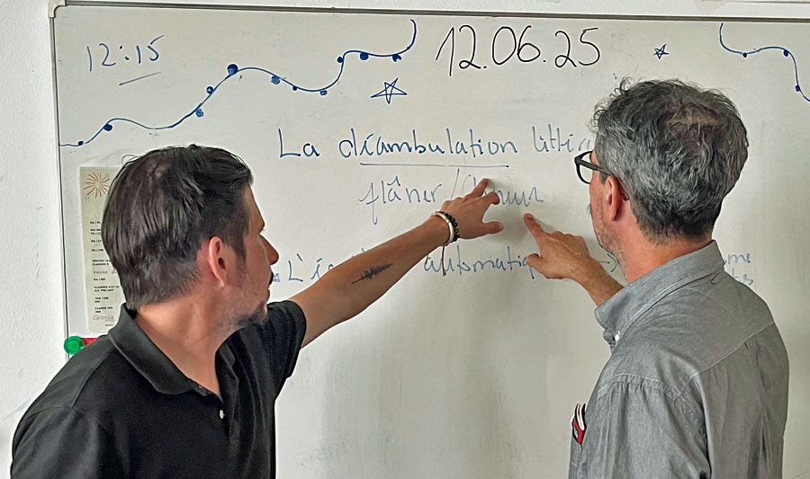 In je zwei Schulstunden stellten sie einer Gruppe von Zehntklässer:innen und dem Grundkurs Französisch Q2 ihre Schreib-Methode vor – die déambulation littéraire, das literarische Flanieren. Anschließend erprobten die Schüler:innen diese selbst. Begleitet wurden sie dabei von Frau Ley und Frau Nürnberger.