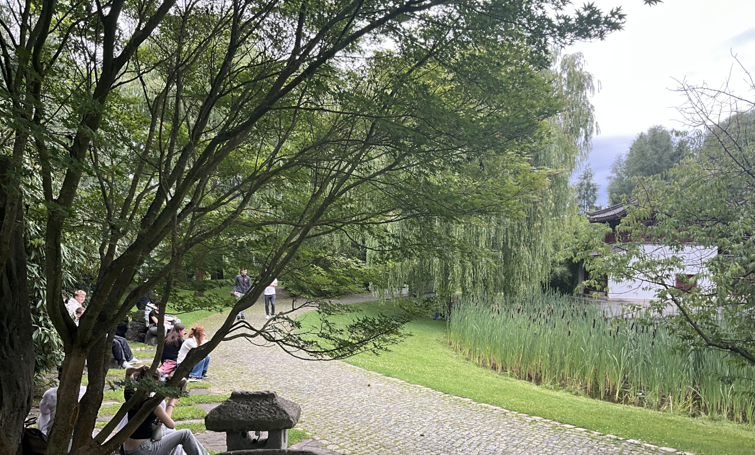 Das Meditieren im Anblick des Teehauses im chinesischen Garten hat seinen ganz eigenen, exotischen, Reiz. Aber auch seine besonderen Schwierigkeiten: spazierend Vorbeikommende müssen mental ausgeblendet werden.