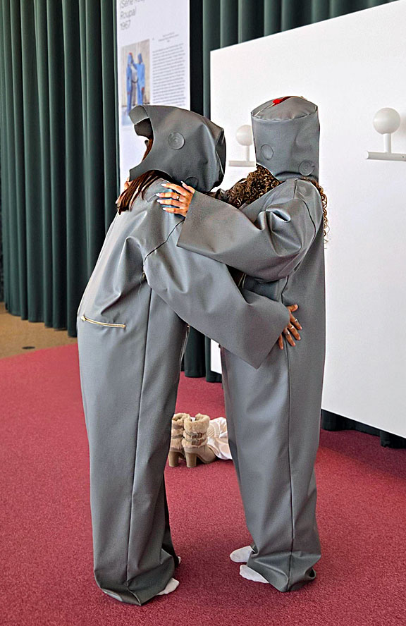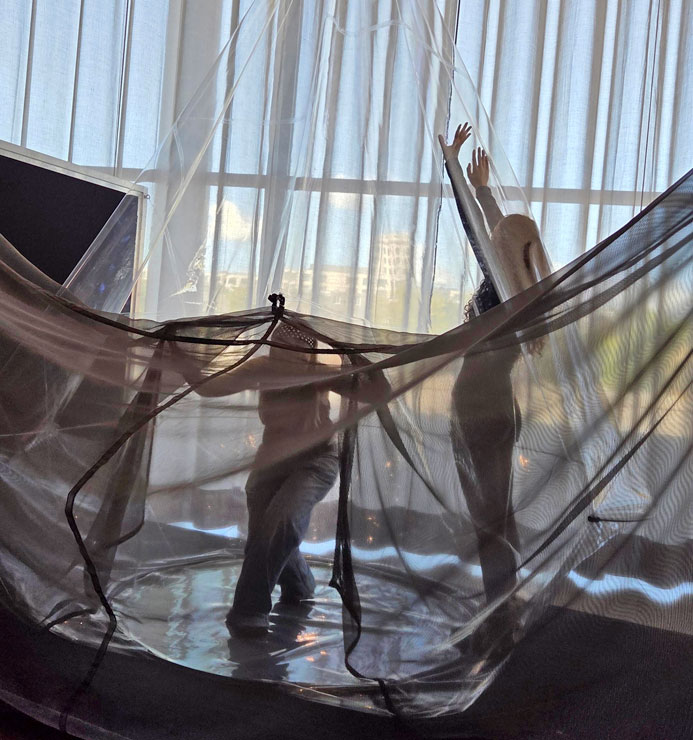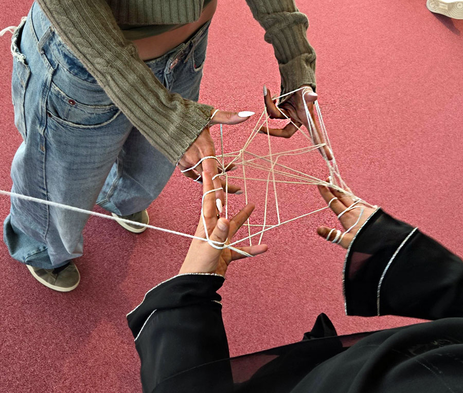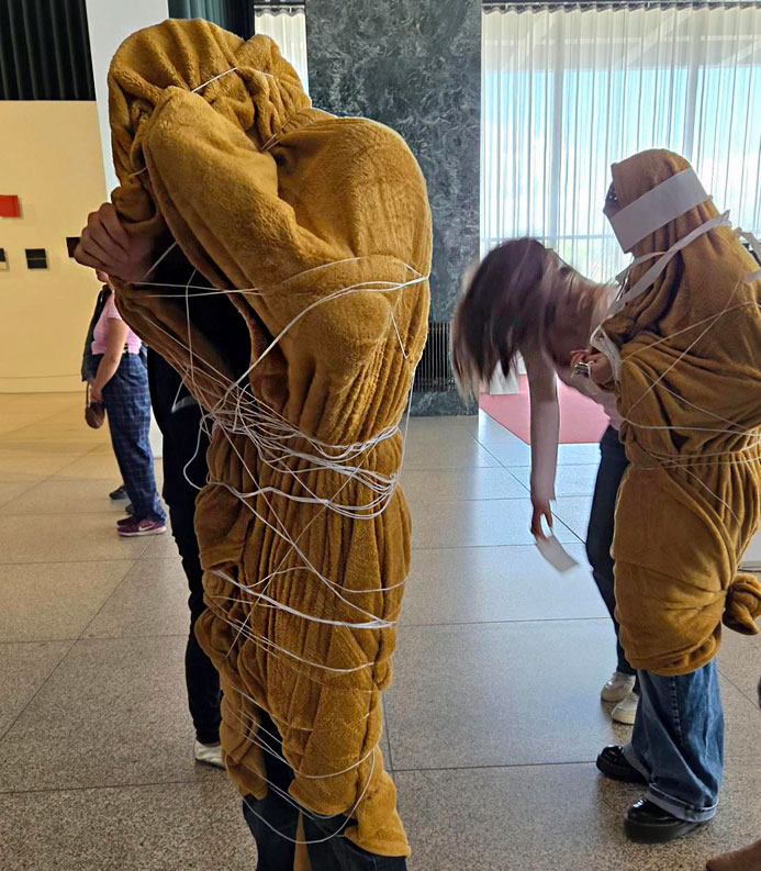 Besonders eindrücklich waren die anschließend präsentierten performativen Ideen, die die Themen „Beziehung“, „Abhängigkeit und Befreiung“ für alle Anwesenden erfahrbar machten. Dabei wurden ganz einfache Elemente wie Schnüre, Decken oder Papierstreifen zu Bedeutungsträgern.