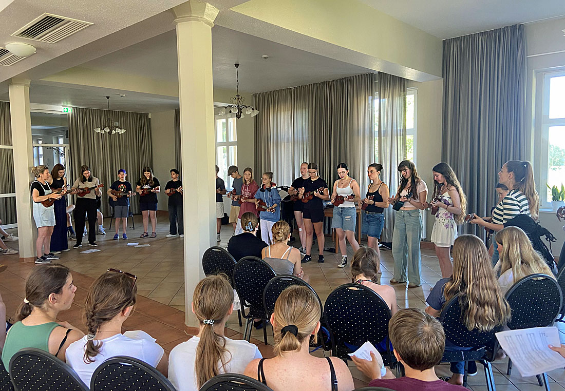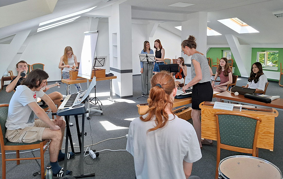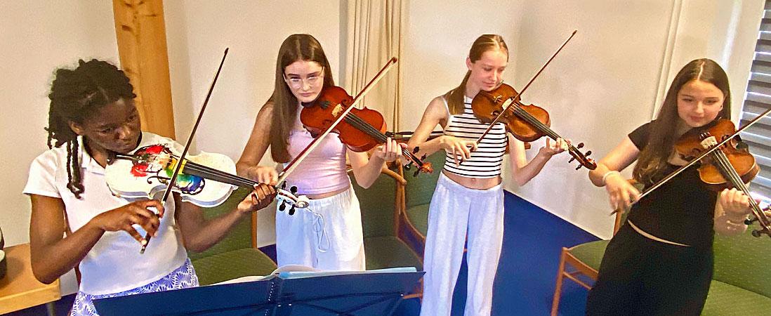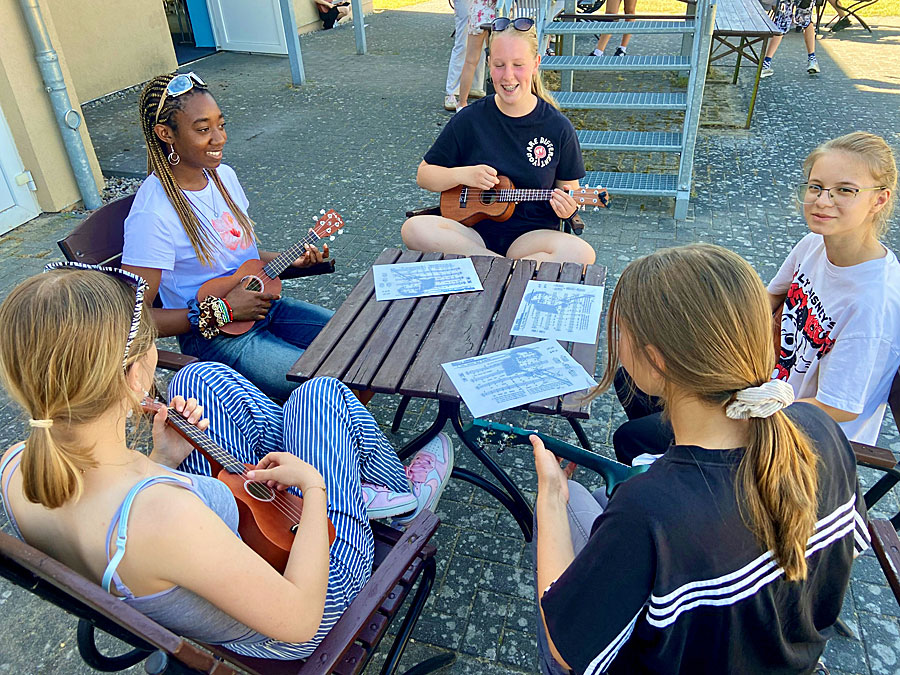 Gemeinsames Singen im Chor, Tanzen, Musizieren im Orchester und in einer Ukulelen-Gruppe sowie Songs schreiben und improvisieren zu Filmmusik-Ausschnitten – all dies macht das Musikkolleg*innen- Team möglich und die Fahrt somit zu einem unvergleichlichen Erlebnis.
