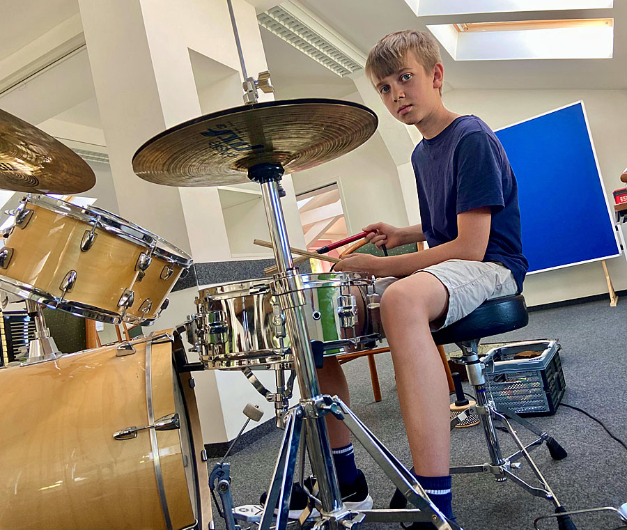 Die Filmmusik AG unter der Leitung von Frau Zimmer macht Klangübungen, hier der Drummer