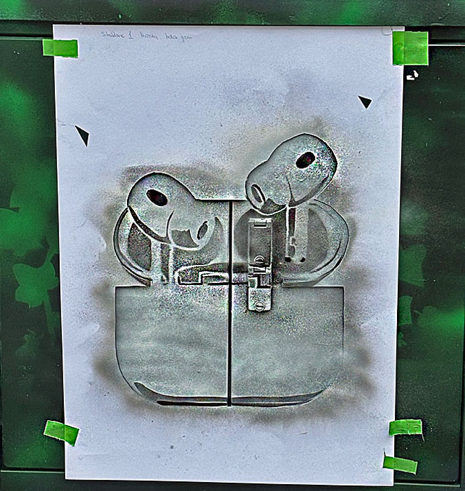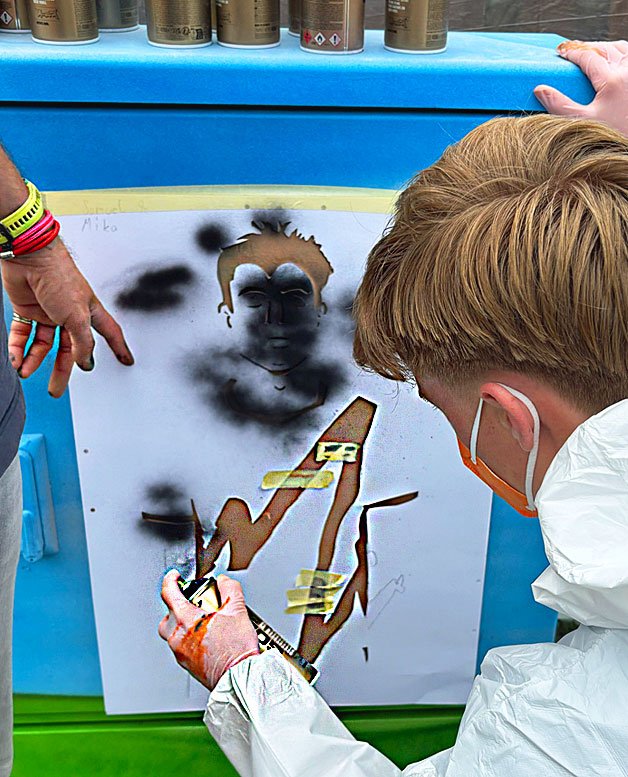 Ausgerüstet mit aufwändigen, mit der Hand geschnittenen Schablonen, 300 Farbsprühdosen, riesigen Schirmen und Zelten, Schutzanzügen, Handschuhen, FFP2- Masken sowie Schutzbrillen sind wir in der Projektwoche, begleitet von Musik, vielen neugierigen Blicken und spannenden Gesprächen in unserem Wohnumfeld unterwegs gewesen.