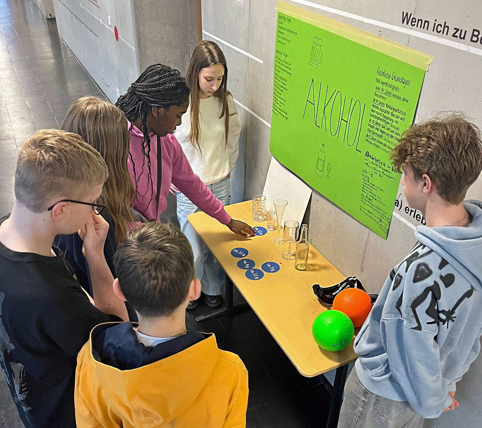 “Mir hat die Alkoholstation am besten gefallen, weil wir durch die Brille selber erfahren konnten, wie es sich anfühlt.” Gloria, 7e